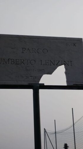 E’ stata danneggiata nuovamente, per la terza volta, la targa del parco a Val Cannuta dedicata a Umberto Lenzini, presidente del primo scudetto della Ss Lazio.