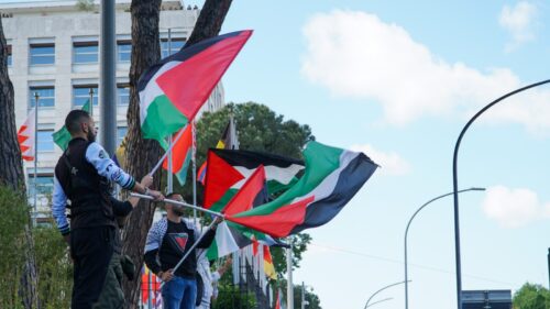 Con la musica in sottofondo del rapper palestinese Shabjdeed, e la sua canzone Inn Ann, è iniziata la manifestazione pro-Palestina davanti all’ambasciata degli Stati Uniti a Roma. Una cinquantina di manifestanti alzano le bandiere palestinesi che si intravedono già poco dopo via Nazionale, in via Leonida Bissolati, presidiata con i furgoncini della polizia di Stato e chiusa al traffico. Molti dei manifestanti indossano al collo la kefiah. Alcuni espongono striscioni in cui si legge “Sanitari per Gaza”, “Stop bombing Gaza, stop genocide”.