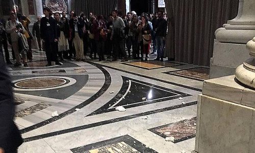 Solo per un caso nessuno dei presenti è stato colpito dai frammenti caduti. Il fatto è successo intorno le 17 con la navata centrale chiusa in vista delle celebrazioni del giovedì Santo i visitatori della basilica quel percorso era un passaggio obbligato. I custodi hanno immediatamente circoscritto l’area interessata dalla caduta dei frammenti alla sinistra del capolavoro di Michelangelo.
