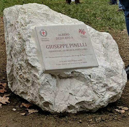 La targa per Giuseppe Pinelli sotto la quercia rossa piantata dal sindaco Giuseppe Sala in piazzale Segesta per i 50 anni dalla morte del ferroviere anarchico. (Foto: Agenzia Nova)