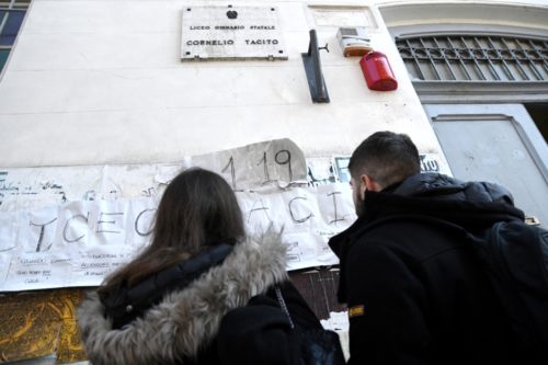 Protesta degli studenti del liceo Tacito in via Giordano Bruno, nel quartiere Prati al centro di Roma, “per la mancanza dei riscaldamenti all’interno della scuola”. Momentaneamente chiuse alla circolazione le strade interessate. Sul posto la polizia e la polizia locale del Gruppo Prati per la viabilità.