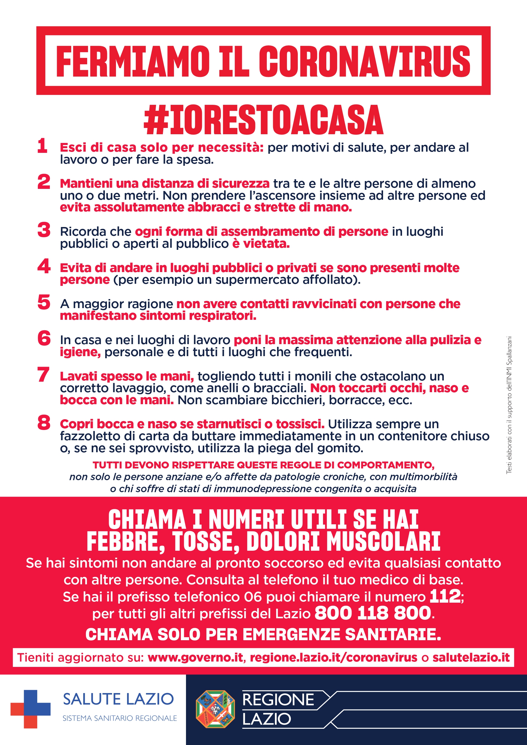 Sul sito dell Regione Lazio (clicca qui)  si trovano info e aggiornamenti, nonché materiali social da condividere per diffondere il messaggio più importante: #iorestoacasa.
