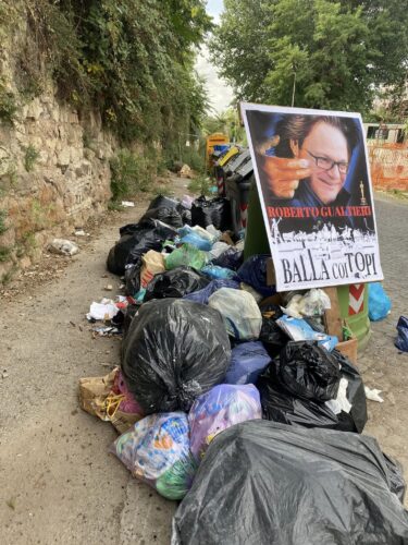 Nel cartellone, realizzato da un residente e postato dal Comitato sui social, protagonista è il sindaco di Roma, Roberto Gualtieri, nelle vesti del noto attore statunitense, posizionato sopra un cumolo di buste e sacchi della spazzatura.