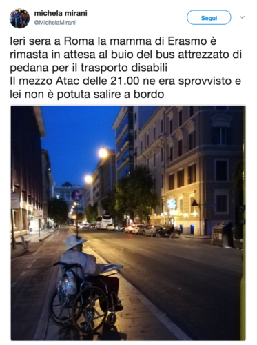 La foto è stata pubblicata sui social da Michela Mirani, responsabile nazionale disabilità di Rivoluzione Cristiana e racconta bene la solitudine e lo sconforto da chi si vede respinto dall’unico mezzo in grado di non farle perdere il contatto con il mondo esterno.