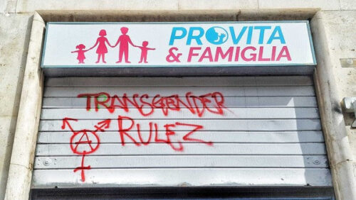 Sulla saracinesca della sede dell’associazione Provita a Roma è stata apposta da ignoti una scritta rossa che recita: “Transgender Rulez”. In una nota l’associazione Provita spiega: “Difficile non collegare questo atto vandalico con la manifestazione transgender che si è svolta a Roma sabato 18 maggio, il giorno dopo la Giornata contro l’omofobia e la transfobia: la prova che la comunità Lgbtqai chiede un rispetto che però non mette in pratica, attaccando in continuazione il diritto di espressione e di esistenza di chi non si allinea all’agenda arcobaleno”.