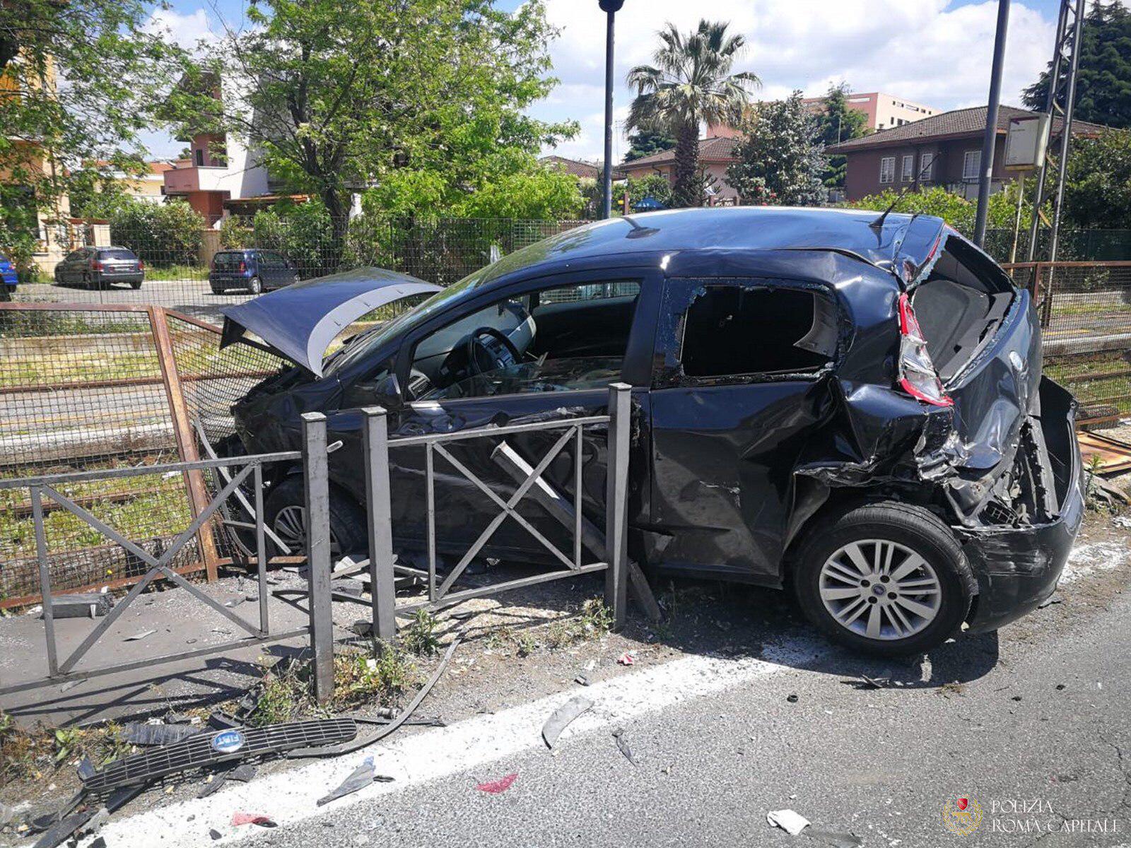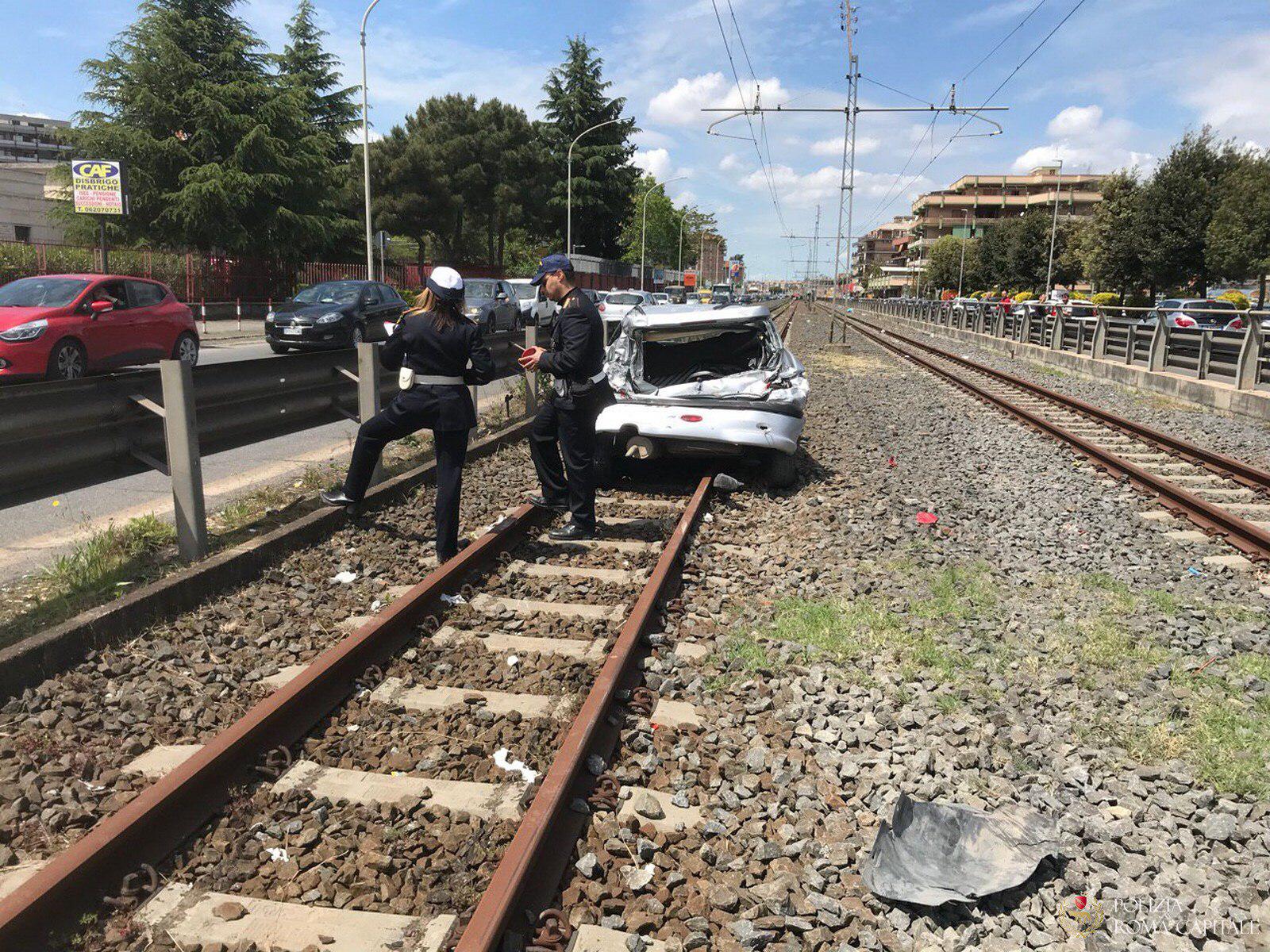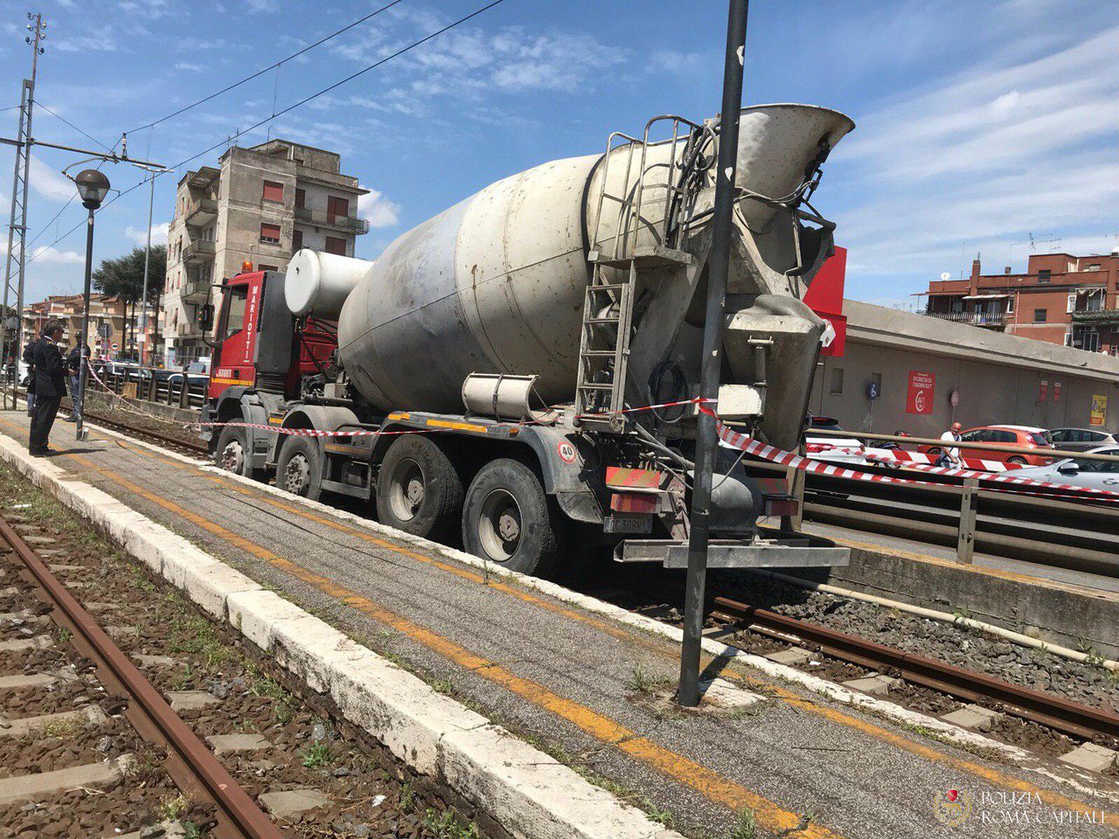 Roma, betoniera travolge auto in sosta e finisce su binari