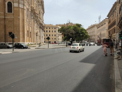 Turisti che si guardano perplessi in giro, come se davanti a loro ci fosse una savana e non una strada appena asfaltata in una delle più importanti città del mondo. Alcuni cercano di intuire la linea immaginaria delle strisce pedonali grazie ai semafori, altri si lanciano in attraversamenti spericolati con il rischio di essere investiti da qualche macchina o scooter. Dall’altra parte ci sono i veicoli, i bus e le moto, che in assenza di segnaletica orizzontale talvolta si fermano o proseguono la propria corsa dove non dovrebbero. Vecchio vizio dei romani quello dell’indisciplina stradale, si dirà, ma questa volta la cattiva abitudine – che come l’erba cattiva, non muore mai – viene alimentata da un’incomprensibile politica di lavori pubblici. Siamo a Corso Vittorio Emanuele, cuore del centro di Roma e strada di collegamento tra Largo Argentina e il lungotevere, in corrispondenza di Borgo Pio. Da molti giorni, infatti, la via che ha ospitato le dimore di noti personaggi della storia italiana come Giulio Andreotti e Julius Evola si presentava fresca di riasfaltatura. Una notizia che sarebbe positiva se non fosse assente un pezzo fondamentale del lavoro: la segnaletica orizzontale. Così, a Corso Vittorio, sono mancate tra le varie cose le strisce pedonali, la separazione tra la corsia destinata alle automobili e quella dedicata a taxi e mezzi pubblici. Una situazione di totale anarchia, come testimoniano le foto di Radiocolonna. Situazione non priva di pericoli per pedoni, motorini e macchine: