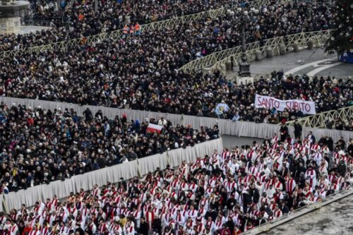 FUNERALI DI PAPA BENEDETTO XVI IN PIAZZA SAN PIETRO JOSEPH RATZINGER VATICANO STRISCIONE SANTO SUBITO FOLLA