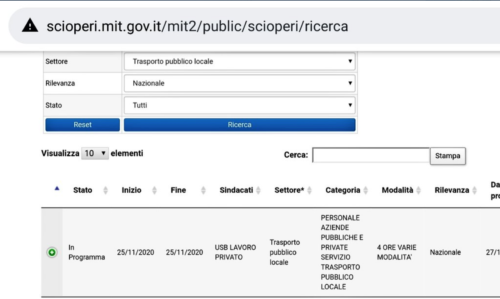 Uno sciopero nazionale dei trasporti “in programma” per mercoledì 25 novembre 2020, della durata di 4 ore, indetto dal sindacato USB. È questa la scoperta fatta da Mercurio Viaggiatore, blogger attento alle questioni legate alla mobilità della Capitale. Una notizia tratta non da comunicati stampa o dichiarazioni ufficiali, ma direttamente dalla ricerca nella sezione ‘scioperi’ del sito del Ministero delle Infrastrutture e dei Trasporti.