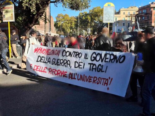 In aria sventolano le bandiere dei collettivi studenteschi e della Palestina, mentre alcuni attivisti hanno posizionato sopra un carrello della spesa un somaro di cartone, al quale è stato appeso un cartello che recita “ministra Bernini”. Sullo striscione di apertura del corteo si legge “Contro un governo di fascisti e sionisti”.