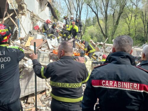 L'intervento dei vigili del fuoco e dei carabinieri presso la palazzina crollata questa mattina nel quartiere Monteverde di Roma, a seguito di un'esplosione.