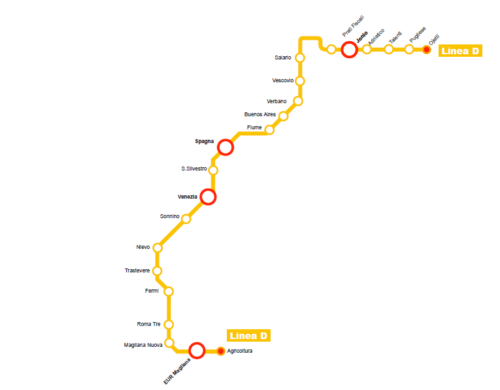 La tratta fondamentale della linea D, spiega MetroXRoma, “collegherà Nuovo Salario al quartiere Marconi, passando per piazza Vescovio, piazza Verbano, piazza Fiume, Spagna (nodo di scambio con la linea A), piazza San Silvestro, Venezia (Nodo di scambio con la linea C), Trastevere e Fermi (nel quartiere Marconi, da distinguersi con la stazione EUR Fermi che si trova per l’appunto all’EUR). Sono poi previsti due prolungamenti, il primo a Nord lungo viale Ojetti, raccordandosi anche alla Metro B1 Jonio, il secondo a Sud verso l’università di Roma Tre ed il quartiere Magliana, per poi raggiungere la stazione EUR Magliana, di scambio con la B, e quindi Piazzale dell’Agricoltura.”