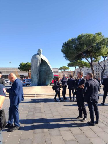 E’ stata ripulita la statua di Papa Giovanni Paolo II a piazza dei Cinquecento, davanti alla stazione Termini di Roma, imbrattata venerdi’ scorso durante il presidio Pro Pa, con la scritta “fascista di m…” e il simbolo della falce e martello, notata sabato scorso dai carabinieri al termine del presidio a sostegno della causa palestinese. Sotto la statua sono stati deposti mazzi di fiori.