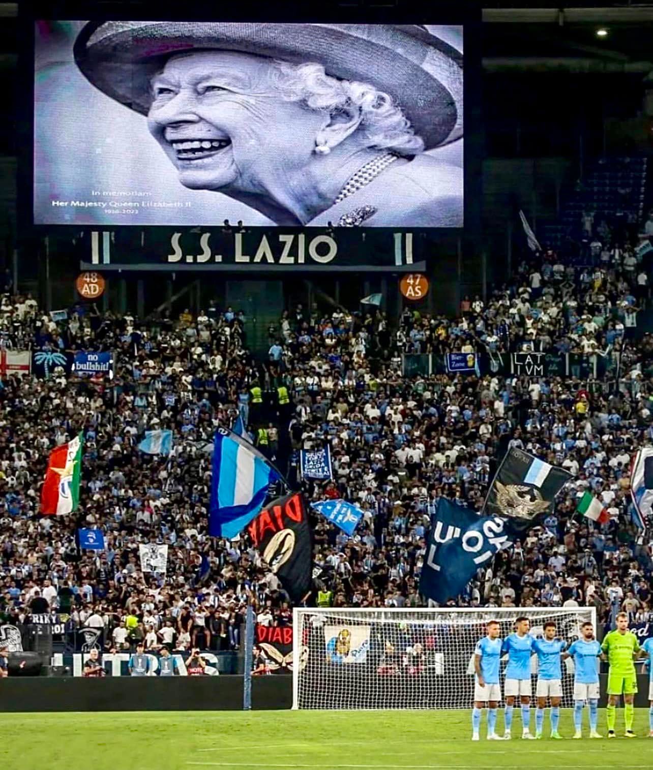 Ieri sera, in occasione della partita d’esordio di Europa league, Lazio-Feyenoord, anche lo stadio Olimpico ha voluto rendere omaggio a The Queen, con un minuto di raccoglimento prima del fischio d’inizio.