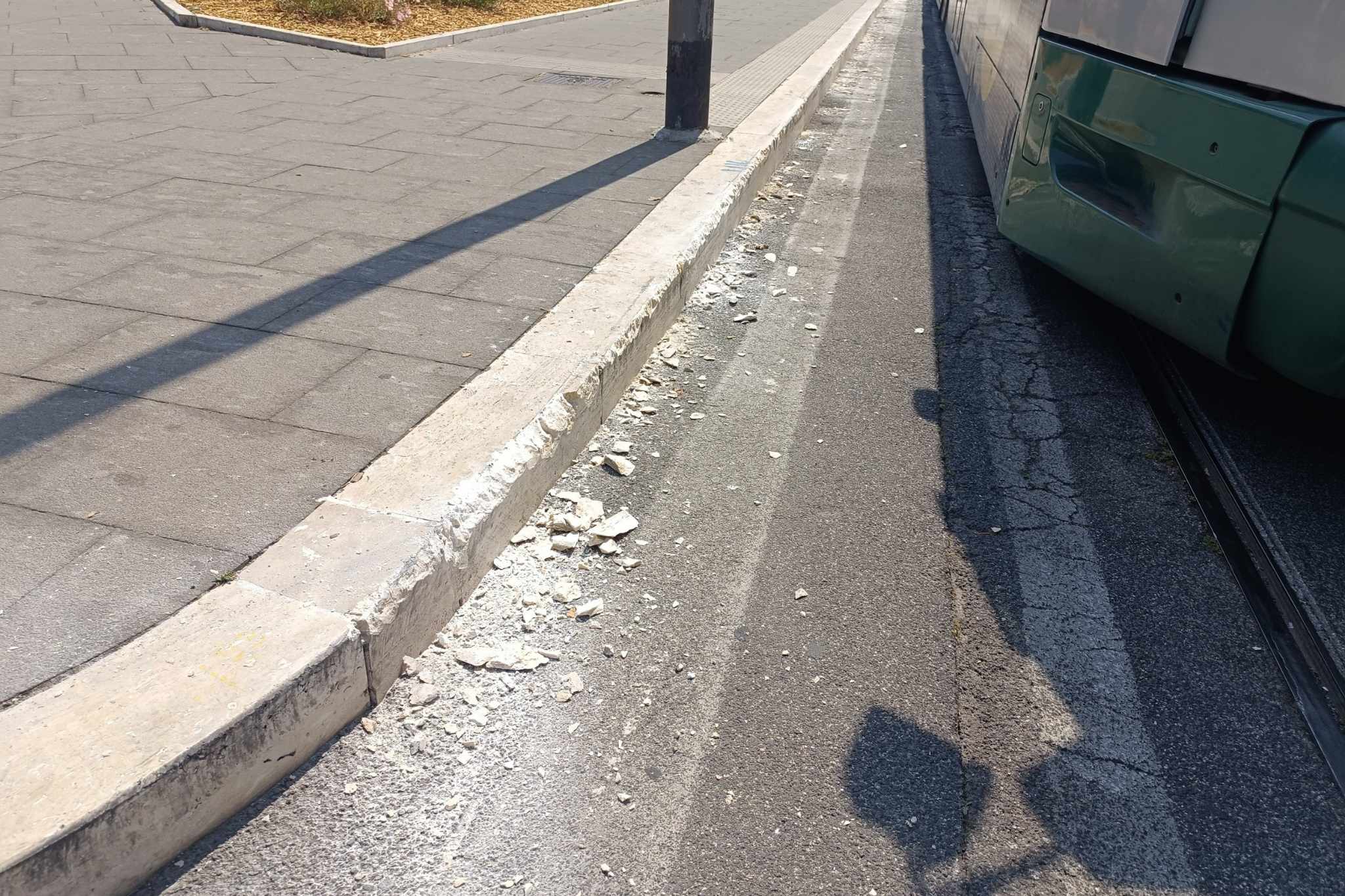 L'impatto sul marciapiede limitrofo del tram della linea 3 uscito dai binari a Ostiense.