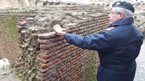 Il frammento della parente interna del Colosseo recuperato di carabinieri