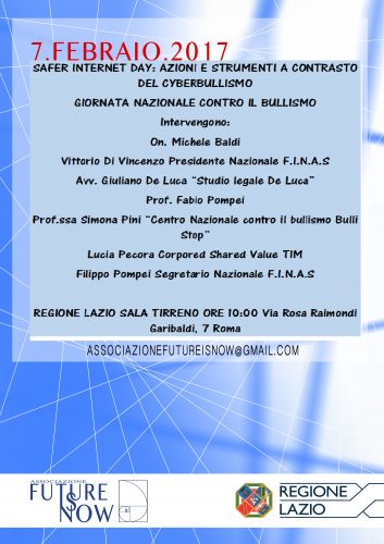 In occasione della Giornata Nazionale contro il Bullismo e del Safer Internet Day, giornata internazionale per la sicurezza in rete, l’associazione studentesca Future Is Now, con il patrocinio della Regione Lazio, ha organizzato un convegno dal titolo “Safer Internet Day 2017, azioni e strumenti a contrasto del cyberbullismo: presentazione aggiornamento Guida al Bullo 2.0”. L’evento, a cui parteciperanno circa 400 studenti delle scuole superiori di Roma e Provincia, si terrà il 7 febbraio 2017 alle ore 10 nella Sala Tirreno della Regione Lazio in Via Rosa Raimondi Garibaldi, 7.