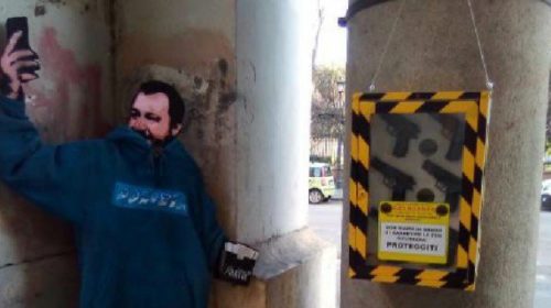 L’ ‘opera’ è firmata da “Sirante”, lo stesso che ha già realizzato diversi murales a Roma che prendevano di mira gli esponenti di governo ed è un’iniziativa contro le modifiche legislative alla legittima difesa, fortemente volute proprio da Salvini. Sulla scatola contenente le finte pistole è infatti scritto “non siamo in grado di garantire la tua sicurezza. Proteggiti”.