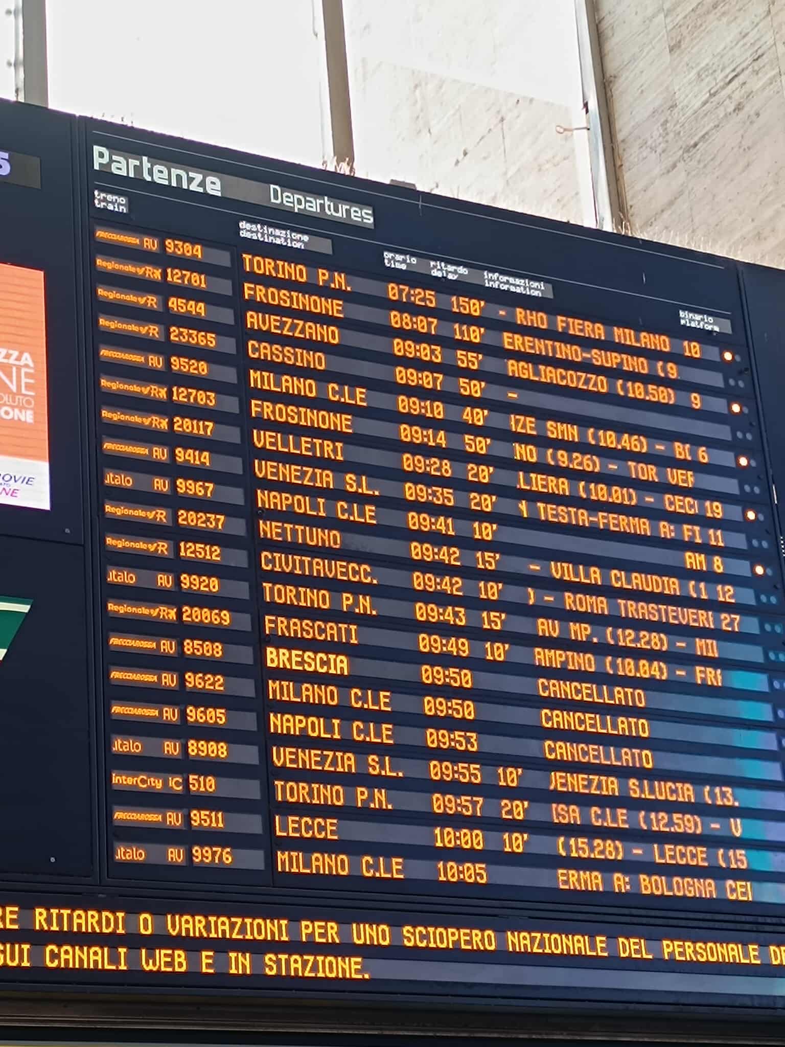 Mattinata di disagi sul fronte dei trasporti ferroviari alla stazione Termini di Roma, a causa dello sciopero generale di 24 ore che coinvolge i settori pubblico e privato, con ritardi fino a 150 minuti e cancellazioni. L’accesso allo scalo è regolato da cancelli, con solo due varchi aperti per entrata e uscita. Intorno alle 10:00, i tabelloni indicavano 150 minuti di ritardo per il Frecciarossa delle 7:25 diretto a Torino, 110 minuti per il regionale delle 8:07 per Frosinone e 55 minuti per il treno delle 9:03 per Avezzano. Soppressi, invece, i Frecciarossa per Brescia e Milano delle 9:50 e quello per Napoli delle 9:53.