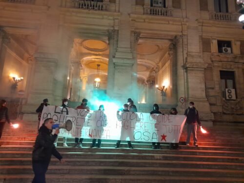 Flash mob di protesta nella tarda serata di ieri davanti al Ministero dell'istruzione a Roma, da parte di un gruppo di studenti di Osa, dopo la morte di Lorenzo, ragazzo di 18 anni di Udine, mentre svolgeva un tirocinio in alternanza scuola-lavoro.