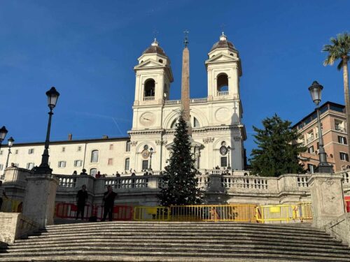 Spunta a piazza di Spagna un albero di Natale con tanto di pennacchio a forma di stella, e decorato con numerose luci e palline colorate. Stupore tra turisti e passanti quando davanti ai loro occhi si è materializzata anche una slitta di Babbo Natale.