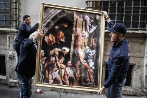 L’opera, ispirata all’affresco di Raffaello “Incendio di Borgo”, che si trova nei Musei Vaticani, e’ stata subito rimossa dalla polizia.