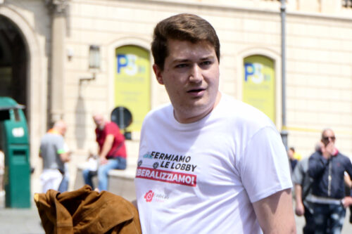 Indossava una maglietta con su scritto: "Fermiamo le lobby. Liberalizziamo! Radicali"
