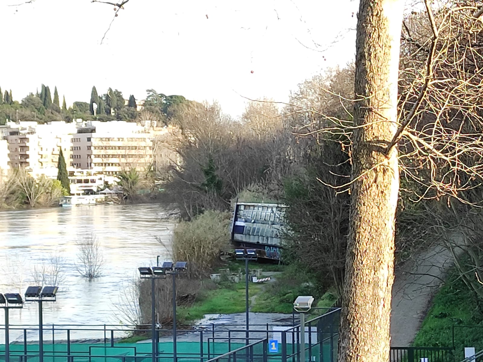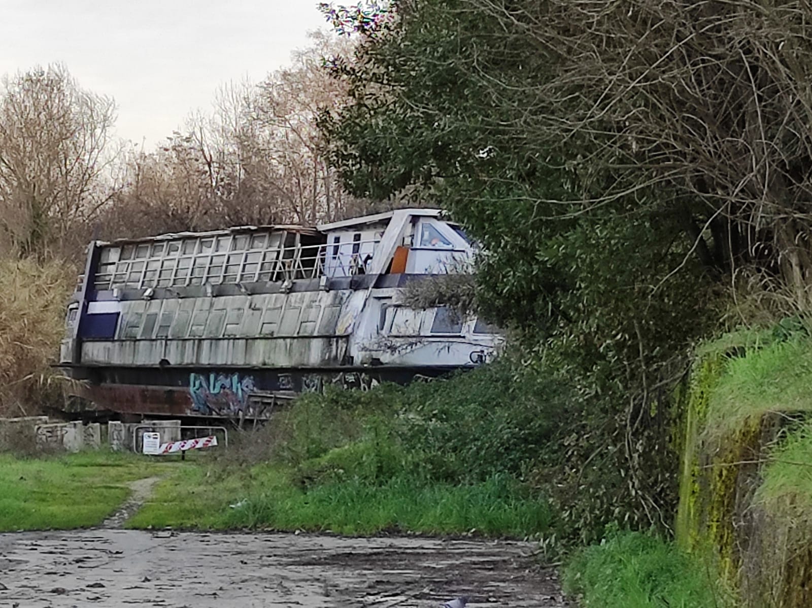 Abbandonato da 13 anni su una banchina del lungotevere della Vittoria c’è il relitto di una nave lunga 37 metri e larga otto: si tratta della Tibur II, naufragata, dopo una piena, nel dicembre del 2008.