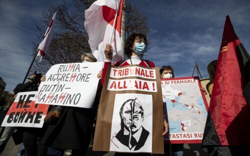 In sostegno dei “fratelli” ucraini sono scesi in piazza anche alcuni cittadini bielorussi e georgiani che si dicono “al fianco del popolo” di Kiev. Come detto, sono tanti i riferimenti a Vladimir Putin: un manifesto ritrae il suo volto con una scritta che fa riferimento a Monaco di Baviera ed al 1938, mentre un altro lo mette visivamente a confronto con lo stesso Hitler e Stalin. “Assassino”, “aggressore” e “dittatore” sono i termini piu’ ricorrenti per definire il leader russo, a cui i manifestanti ricordano: “Noi non siamo occupanti, noi siamo i difensori della nostra patria”.