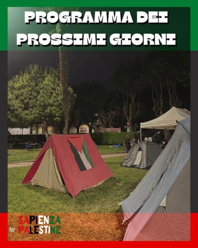 “In continuazione con il percorso di mobilitazione che stiamo portando avanti da mesi in solidarietà alla Palestina abbiamo deciso di tornare in tenda alla Sapienza”, fanno sapere sui social network gli studenti del Coordinamento collettivi Sapienza, di Cambiare Rotta e del Movimento degli studenti palestinesi.