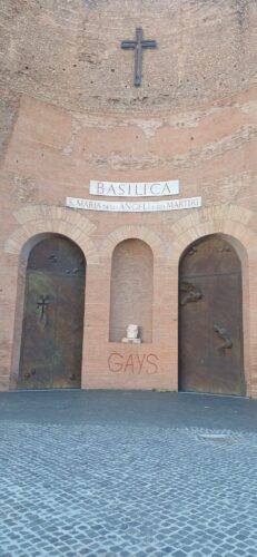 Un gesto vandalico colpisce uno dei luoghi simbolo del centro di Roma. Nella notte, ignoti hanno imbrattato la facciata della Basilica di Santa Maria degli Angeli e dei Martiri, affacciata su Piazza della Repubblica, con una scritta in vernice rossa comparsa tra i portali d’ingresso.