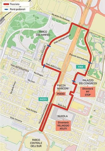 Subito una curva a U sulla Cristoforo Colombo per mettere alla prova i piloti. Ecco la Nuvola di Fuksas, villaggio degli atleti per una settimana. Quindi, in rapida successione, viale Asia, via Stendhal e via Montaigne. Un rapido passaggio in piazza John Fitzgerald Kennedy, di fronte alla