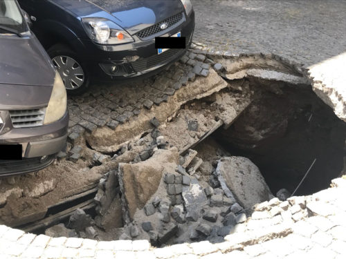 In via Marco Aurelio un grosso cedimento ha messo in allarme la zona e obbligato all'evacuazione di una palazzina vicina alla voragine