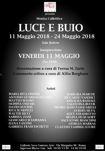 All’interno della mostra “LUCE E BUIO” verranno proposte le opere degli artisti Maria Rita Onofri, Antonio Guardavaccaro, Matteo Mauro, Olimpia Undari, David Olivieri, Rita Scarpelli, Walter Ricci, Sabrina Ziani, Giancarlo Sciamanna, Elena Fantini, Gabriele Franceschetti, Giorgia Marras, Barbara Marchi, Pietro Aldo Pasquarelli, Riccardo Vasdeki, Annalisa Badiali, Valentina Bucur, Lurdes Silva, Alice Stradiotto, Regina di Quadry, Salvatore Bianchini, Claudio Fabbricatore.