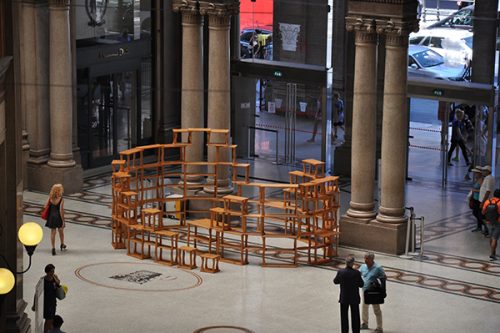 COLOSSEA, di Antonio Bruni, è una scultura libreria che vuol accogliere la pluralità delle espressioni in una composizione a spirale, immagine del sapere che avvolge, ma non rinchiude e non esclude. Quarantaquattro elementi diseguali di ciliegio massello formano l’istallazione che non è collocabile in esterni.