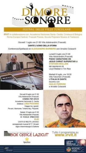 Si parte giovedì primo luglio alle 21 a Villa Aldobrandini con “Dante l’uomo della storia”: conferenza-spettacolo di Alessandro Barbero accompagnato dal critico letterario Arnaldo Colasanti. Nel corso dell’evento, in collaborazione con l’Associazione Frascati Poesia, Barbero, uno degli storici contemporanei italiani più amati dal pubblico, porterà sul palco il ritratto live del sommo poeta che, sebbene morto nel 1221, è ancora profondamente contemporaneo per quella capacità di esprimere l’amore, l’odio e le grandi emozioni che è di fatto il segreto della Divina Commedia. Alessandro Barbero riscrive la biografia di Dante cercando qualcosa che vada oltre l’uomo o lo scrittore e raccontare così la storia di un’epoca (prezzo del biglietto: 10 euro posto unico).