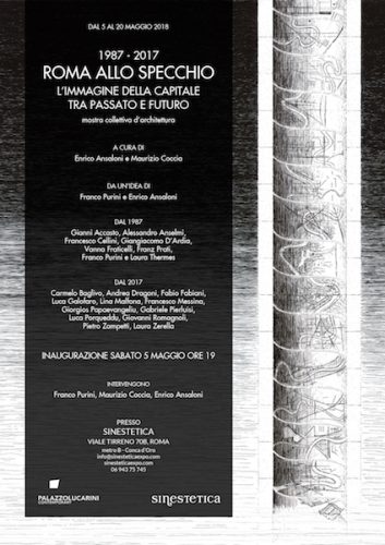 Sabato 5 maggio, alle ore 19.00, presso lo spazio Sinestetica, in viale Tirreno 70b, nel quartiere di Montesacro a Roma, si terrà la presentazione e l’inaugurazione della mostra “1987 – 2017. Roma allo specchio. L’immagine della capitale tra passato e futuro”, un confronto fra architetti di diverse generazioni a distanza di trent’anni, sul tema della città di Roma e sul suo futuro.