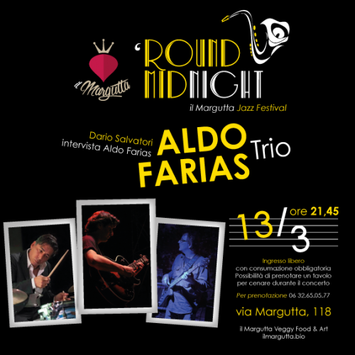 Lunedi 13 Marzo 2017, nuova tappa per ‘Round midnight’, Il Margutta jazz festival vi aspetta insieme al chitarrista e compositore napoletano Aldo Farias che si esibirà in trio con Angelo Farias e Pierpaolo Pozzi.