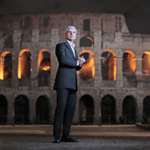 Abiti statuari, bianco e nero a dominare la scena e sfumature di verde e rosso per arricchirla; tessuti pregiati, ricami con linee geometriche lavorate con il filo di seta, specchi e cristalli; intarsi in pelle, contrasti che creano armonia tra i colori, forme che rievocano l’impero romano e relative contaminazioni osservate fin da bambino in medio oriente, si fonderanno per permettere a grandi professioniste di sfilare e onorare la Città Eterna.