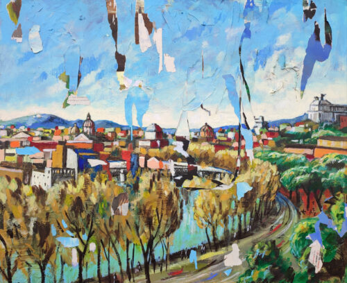 Guglielmo Mattei inizia il percorso della sua mostra personale con una Roma deserta, silenziosa che definisce “Paesaggi dalla fine del mondo”. Le sue opere – si legga in una nota – sono percorsi immersivi che si frequentano quotidianamente e che si percepiscono in maniera familiare. Con pitture classiche Guglielmo Mattei si apre a un dialogo sperimentale raccontando una Roma stratificata da secoli di storia con un linguaggio formale e contemporaneo al tempo stesso, fatto di carte sovrapposte e pitture, creando un dialogo tra materia e colore.
