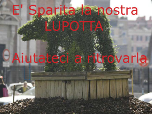 Appello ai Cittadini "E' scomparsa da p.zza Venezia la lupa capitolina versione green. Chiunque abbia sue notizie contatti il Campidoglio"