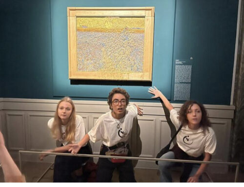 Il quadro, protetto dal vetro, è esposto nell’ambito della mostra dedicata all’artista che ospita le opere del Museo Kröller-Müller di Otterlo. Subito dopo l’azione è intervenuta la sicurezza. Gli attivisti si sono poi incollati alla parete e hanno urlato slogan contro l’uso del carbone e sul cambiamento climatico.