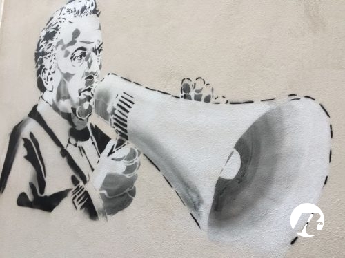 E proprio a fianco del portone l’altra mattina è comparso un piccolo murale (autore ignoto) che ritrae l’illustre regista in un atteggiamento a lui familiare e iconografico. Fellini che con il megafono dirige la troupe impegnata nell’ennesimo capolavoro.