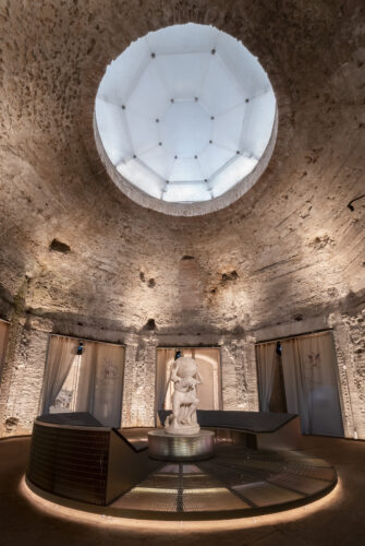 Roma, Domus Aurea. Sala Ottagona allestita con la scultura dell’Atlante Farnese (Museo Archeologico Nazionale di Napoli) per la mostra Raffaello e la Domus aurea. L’invenzione delle grottesche Crediti: ©ph ERCO illuminazione