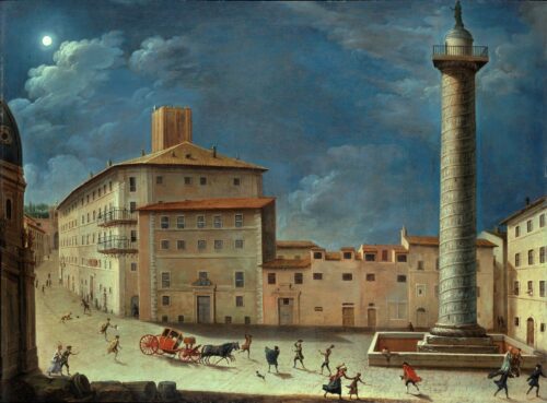 Nel dipinto “scena di genere presso la Colonna Traiana” illustrato da Strinati c’è un piccolo mondo: a prima vista sembra una scena di genere tipica del periodo, di fine eleganza e compostezza, ma c’è molto di più. Giacomo Van Lint, senza che l’osservatore se ne renda conto, ci porta verso i primordi della cronaca giornalistica moderna, proprio mentre a Roma e in Europa si affermava il fenomeno del giornalismo moderno con bollettini e giornali molto letti dai nobili e dal popolo romano, oltre che dai turisti. E può darsi, afferma Strinati, che Van Lint abbia raccontato nel suo dipinto un “incidente” riportato anche dalla cronaca locale dei tempi.