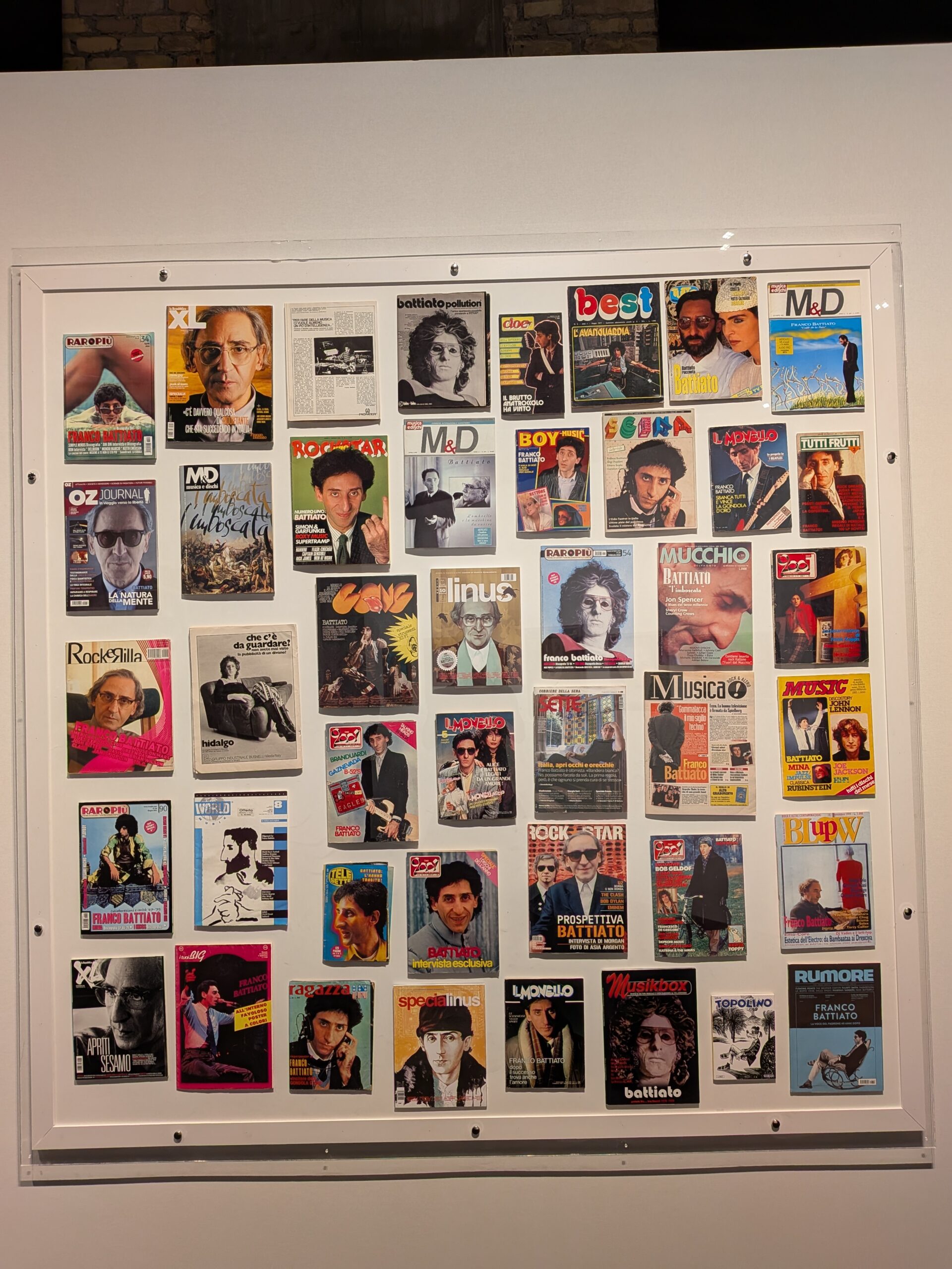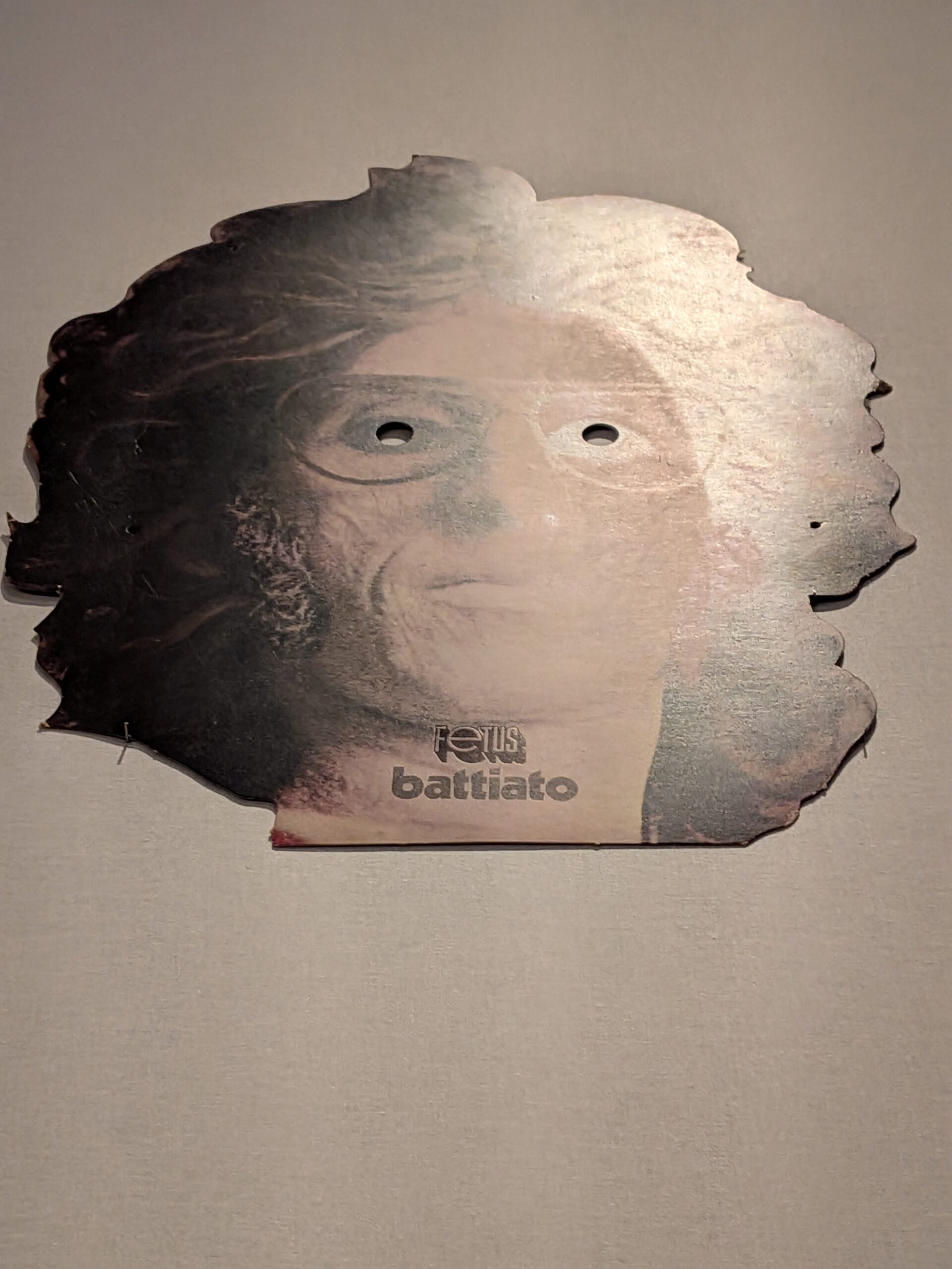 Tra le chicche della mostra, la sua discografia completa in 33 e 45 giri, i quadri (di cui uno di Bin Laden, sic) ma anche i sintetizzatori e gli strumenti elettronici che lo hanno accompagnato nella sua carriera cinquantennale. Notevole, al centro della sala che ha ospitato l’esposizione, la presenza di una saletta buia dove vengono proiettati i video musicali di Franco Battiato: oltre dieci casse che rendono l’esperienza sonora preziosa e indimenticabile