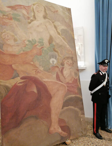 “Abbiamo preservato questa opera per decenni – ha dichiarato il generale di corpo d’armata Antonio de Vita – e una volta scoperto il suo valore artistico siamo promotori del restauro insieme alla Soprintendenza, che ringrazio per lo studio e il progetto dell’intervento conservativo, e Intesa Sanpaolo che lo sostiene”. Daniela Porro, Soprintendente Speciale di Roma, ringrazia a sua volta la “pregevole memoria visiva del nostro architetto Alessandro Mascherucci. Di questo affresco, infatti, non rimanevano che sbiadite immagini in bianco e nero”. L’architetto, da responsabile delle opere contenute nella caserma, racconta di essersi appassionato alla ricerca della provenienza delle due opere durante i mesi del lockdown per il Covid e di aver in quei mesi identificato l’autore: per ornare la cappella del Collegio era stato chiamato Ludovico David, artista “colto”, di cui l’Italia conserva pochissime testimonianze del suo lavoro. A Roma, oltre a queste porzioni di affresco salvate dalla distruzione, c’è solo una pala d’altare sempre del Collegio Clementino e due tele custodite nella chiesa di Sant’Andrea al Quirinale. Proprio questo ritrovamento lascia ora sperare che possa essersi salvato qualche altro frammento dell’affresco, custodito da qualche collezionista privato: “Non era raro che quando si decideva una demolizione, una volta messe in sicurezza le parti che dovevano essere salvate, gli addetti del cantiere si appropriassero di porzioni di affresco che altrimenti sarebbero finite alla discarica” afferma Alessandro Mascherucci. Proprio ieri, racconta la Soprintendente, quando le due porzioni di affresco sono state staccate dal muro per avviare il restauro, la ricostruzione della storia degli affreschi è stata confermata: dietro uno dei pannelli è comparso un cartoncino del 1936 che certifica la provenienza dell’opera e indica che i due resti erano destinati “alla sala Corsini, ma per mancanza di locali, portate a palazzo Venezia”.