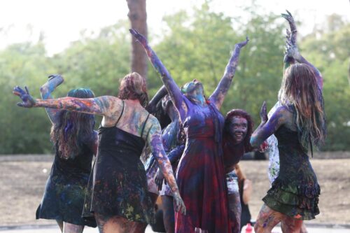 Sette performer hanno dipinto con i loro corpi la prima grande Tela Danzata e Musicata: sono Francesca Chialà, la ballerina/attrice Valeria Vignati e le ballerine Maria Chiara Selva, Barbara Canu, Francesca Santeddu, Victoria Markakis, Giada Pasqualucci hanno intinto i loro corpi nei sette colori che corrispondono ai sette Chakra e, danzando, hanno colorato la tela che copriva il grande Cerchio dell’Anfiteatro. La danza è iniziata con la colonna sonora della Serie Cinematografica in Virtual Reality, suonata dal vivo dal chitarrista Enrico Cresci, accompagnato al contrabbasso dal noto jazzista Dario Rosciglione, alla chitarra elettrica dal compositore Marco Sinopoli e cantata da Isabella Alfano.