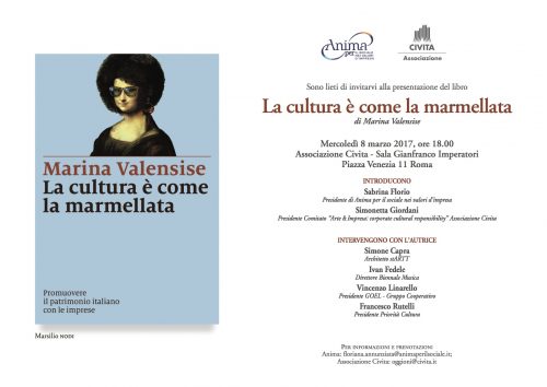 Questo uno dei temi che verranno affrontati in occasione dell’incontro di presentazione del libro “La cultura è come la marmellata” di Marina Valensise, organizzato da Anima per il sociale nei valori d’impresa e Associazione Civita, previsto per mercoledì 8 marzo, alle ore 18.00, presso la sede romana dell’Associazione Civita, Sala Gianfranco Imperatori a Piazza Venezia, 11.