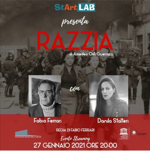 Fabio Ferrari e Danila Stalteri da due anni lo rappresentano nei teatri e nelle scuole con grande emozione; quest’anno purtroppo non è possibile farlo… Vogliamo però celebrare lo stesso questa giornata: RAZZIA andrà in onda in diretta streaming il 27 gennaio alle 20:00 sul canale Youtube Start Lab Tv. A seguire ci sarà un talk show in cui il pubblico da casa potrà interagire in diretta con i protagonisti e l’autore, lo storico Amedeo Osti Guerrazzi.